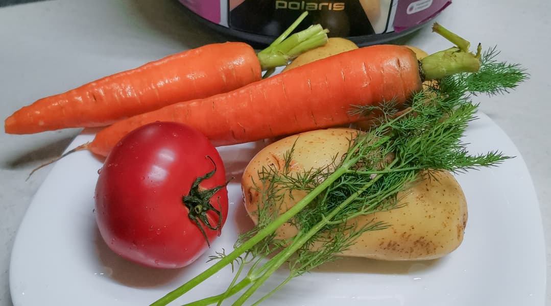 Пока ребра варились, подготовили овощи — почистили и порезали картошку и морковку.
