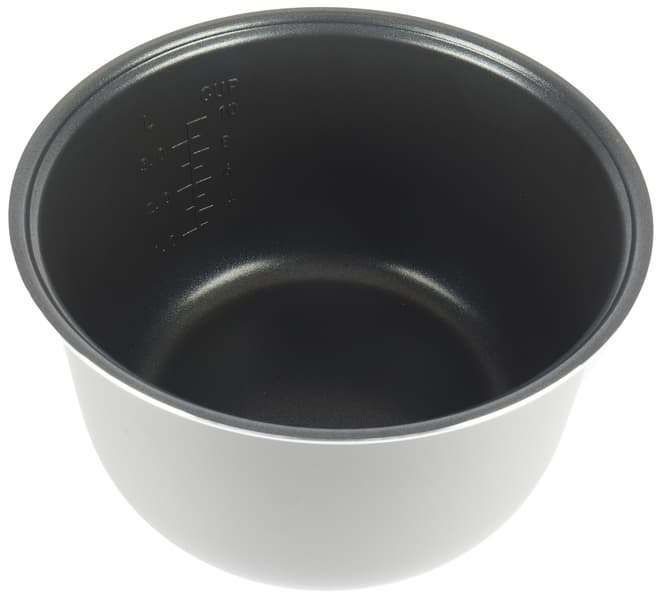 Чаша мультиварки полной емкостью в 5 литров достаточно толстостенная с хорошим антипригарным покрытием. На стенке — мерная шкала в чашках и литрах. Максимальное значение — 10 чашек или 3,5 литра, это полезный объем. Высота чаши составляет 14 см. По нашим наблюдениям, к данной модели, кроме собственных, подходят чаши от модели Redmond M150.