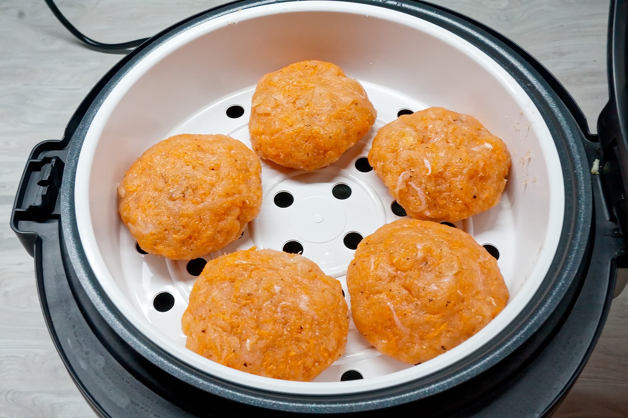 Сформировали котлетки. Готовили в режиме «На пару́» 20 минут (плюс 10 минут потребовалось на предварительный разогрев воды).