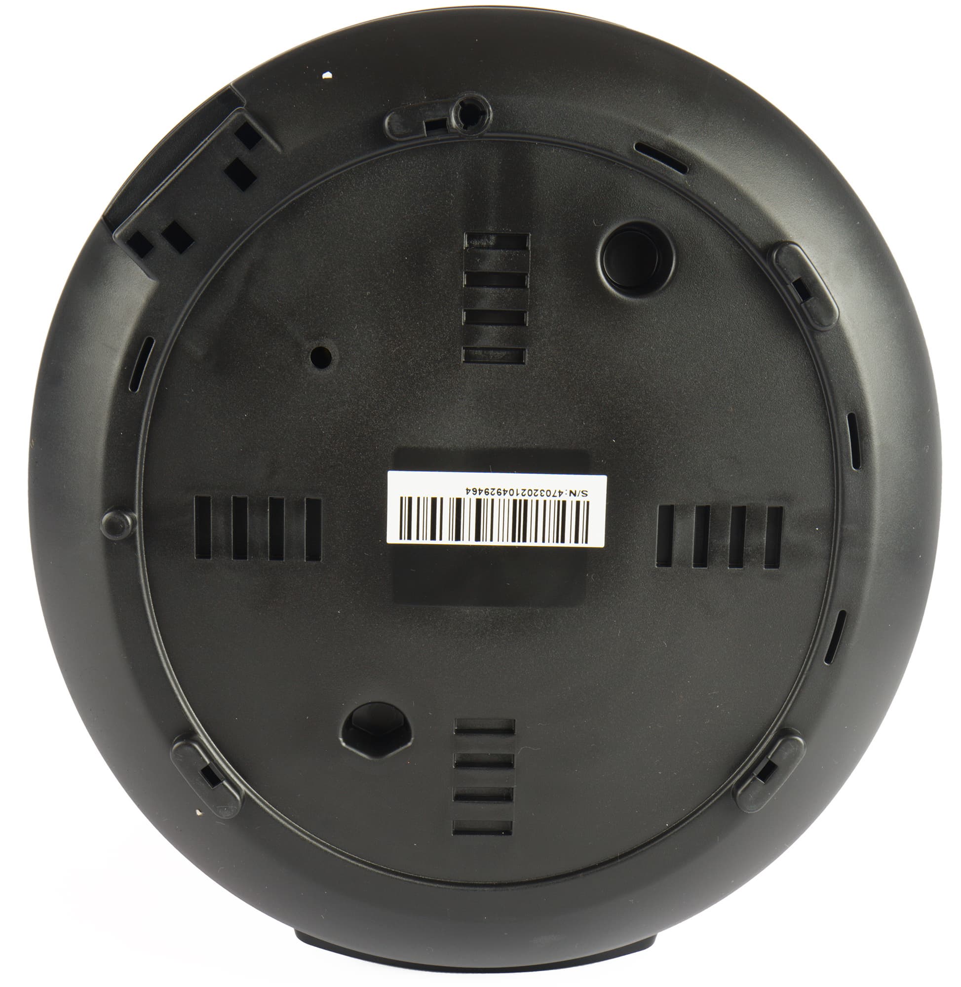 С тыльной стороны находится съемный пластиковый контейнер для сбора конденсата. Ниже — наклейка с технической информацией. Справа снизу — разъем для подключения провода питания.