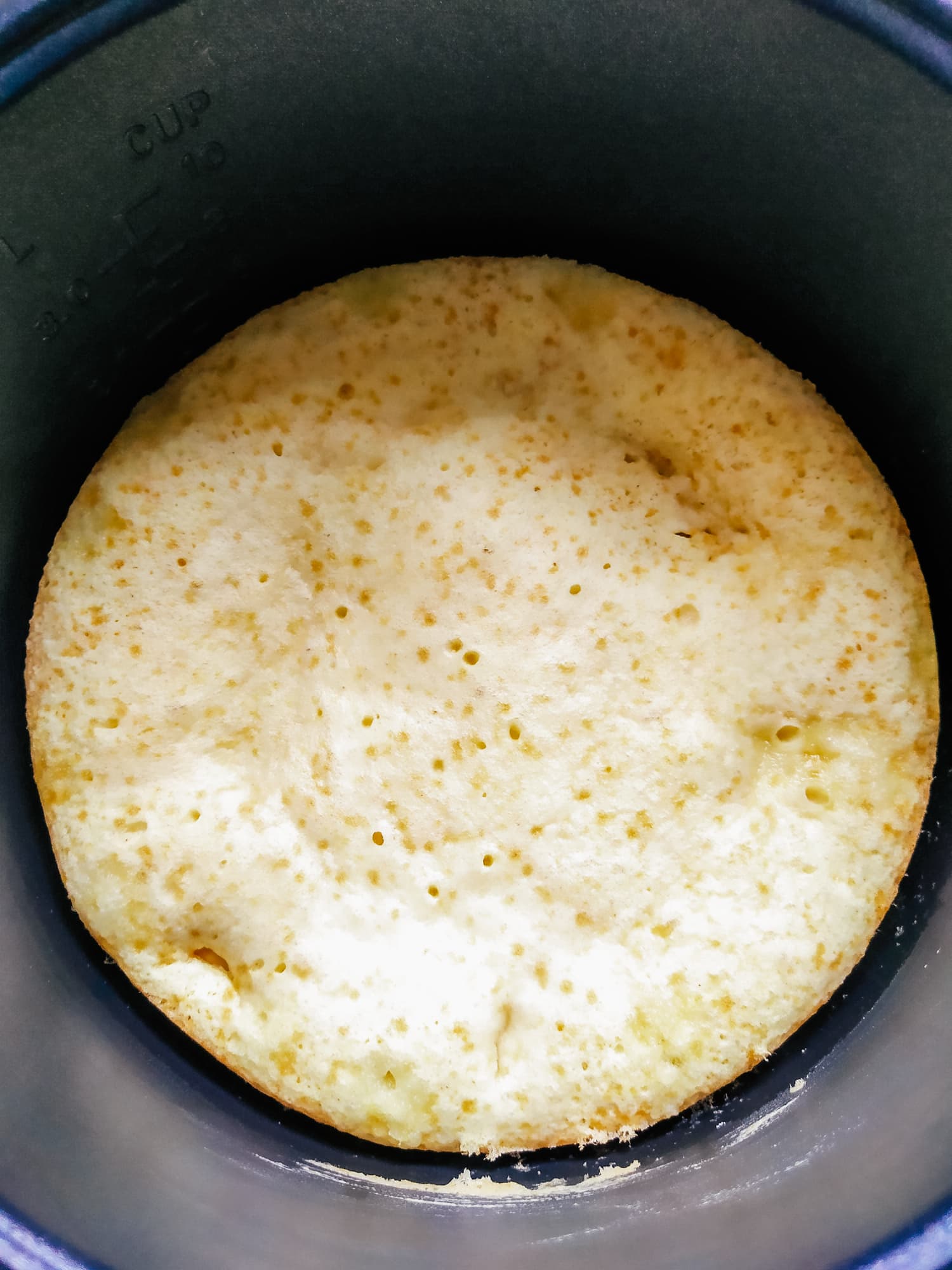 По истечении заданного времени проверили тесто зубочисткой. Несмотря на невысокую температуру (в режиме «Выпечка» это 130 °C), бисквит отлично пропекся, не осел и не потерял воздушность.