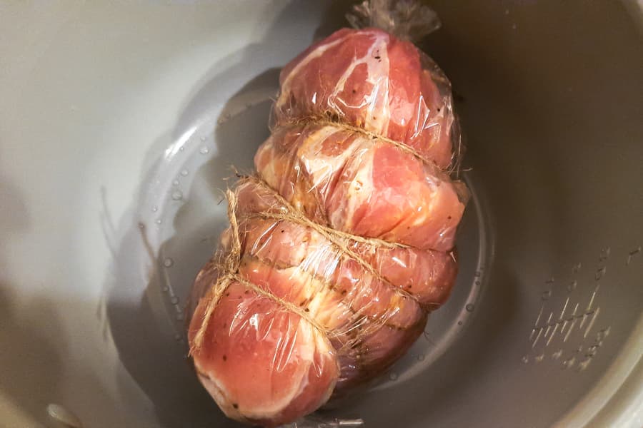 1 кг свиного окорока, предварительно выдержанного в солевом растворе в течение 12 часов, обвязали шпагатом, упаковали в рукав для запекания и еще раз перевязали.