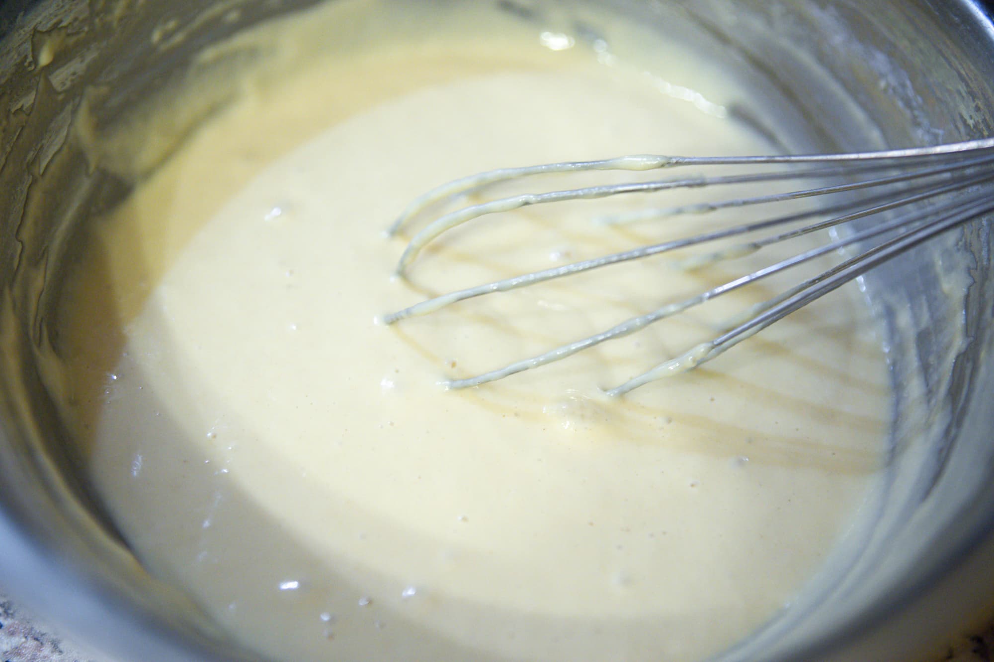 В кефир добавили половину чайной ложки соды и отставили в сторону минут на 15. В отдельную емкость разбили яйца, добавили к ним немного соли и сахара и перемешали венчиком. Муку просеяли. В яичную смесь добавили кефир. Постоянно помешивая получившуюся массу венчиком, тонкой струйкой ввели муку, ориентируясь на консистенцию теста. Оно не должно быть слишком жидким — скорее, как густая сметана.
