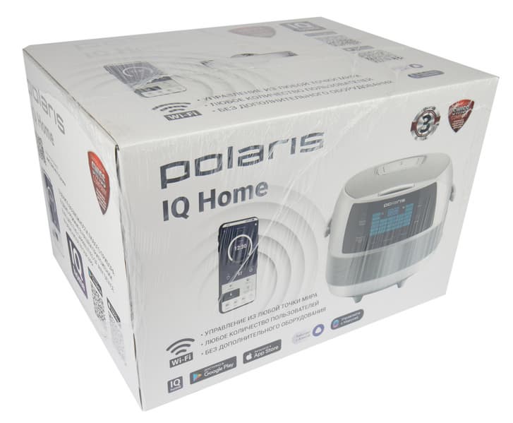 Polaris PMC 5040 Wi-Fi IQ Home упакована в большую картонную коробку с пластиковой ручкой для переноски. На фронтальной части находится изображение мультиварки в паре со смартфоном, указывающим на главную особенность приборов линейки IQ Home — возможность дистанционного управления устройством через фирменное приложение. Просканировав QR-коды для Google Play или App Store, пользователь попадает на страницу приложения IQ Home и при желании, еще до покупки прибора, может ознакомиться с функцией управления мультиваркой в демо-версии.