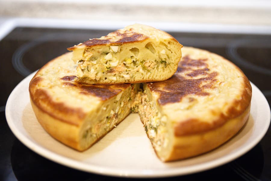 Ингредиенты для теста: пшеничная мука — 200 г, кефир (1% жирности) — 250 мл, два яйца, сода — 0,5 ч. л., соль и сахар — по вкусу