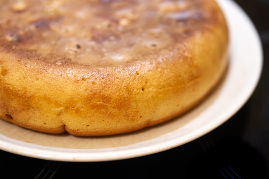 Через 10 минут проверили нижнюю часть — корочка схватилась, но еще недостаточно. Вернули пирог обратно и выпекали еще 10 минут. Извлекли ароматный пирог из чаши и дали ему немного остыть.