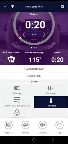 Температура и время программы регулируются перемещением бегунка по окружности. «Мой рецепт Plus» в приложении позволяет записать до 9 этапов приготовления одного блюда, сохранить его в «Персональные режимы» с возможностью делиться рецептом.