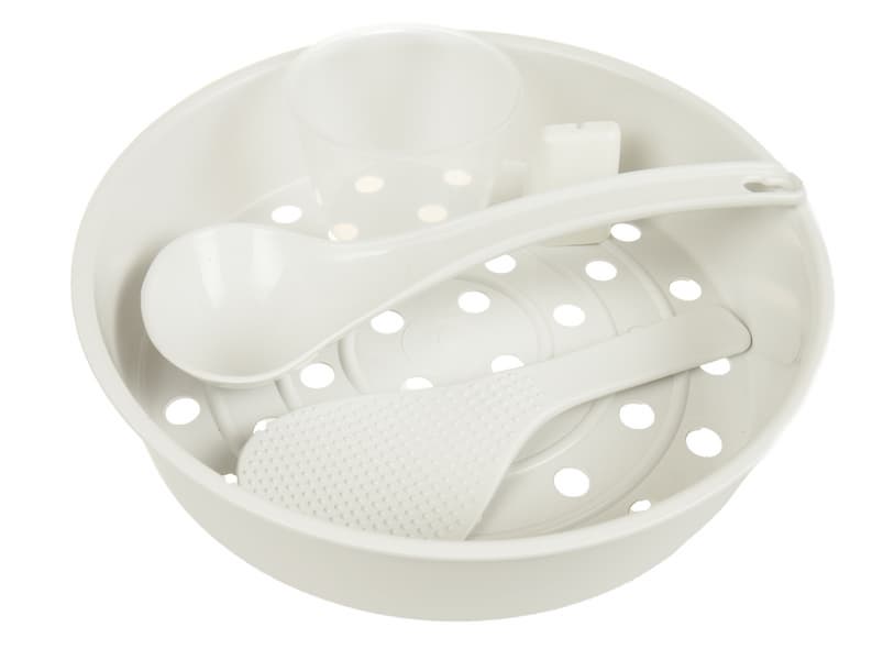 В комплект Polaris PMC 5040 Wi-Fi IQ Home входит стандартный набор аксессуаров: контейнер для варки на пару́, ложки двух видов (плоская и глубокая), мерный стаканчик и баночки для йогурта. Цвет белый, материал — пластик. Держатель для ложек крепится на боку корпуса мультиварки.