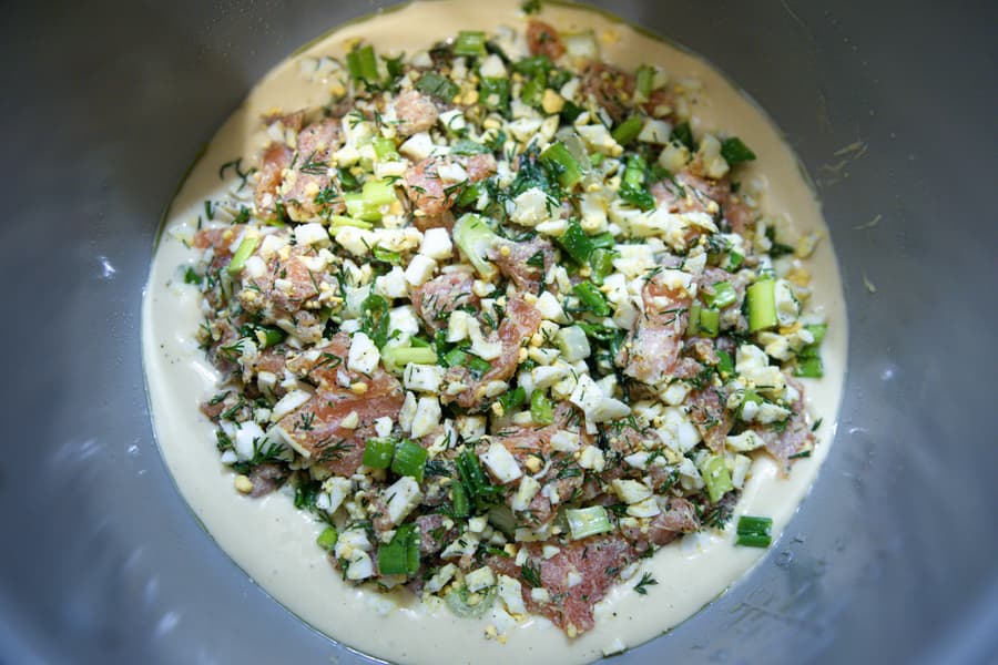 Для начинки перемешали нарезанные вареные яйца, сырую красную рыбу и зеленый лук. Слегка подсолили и поперчили.