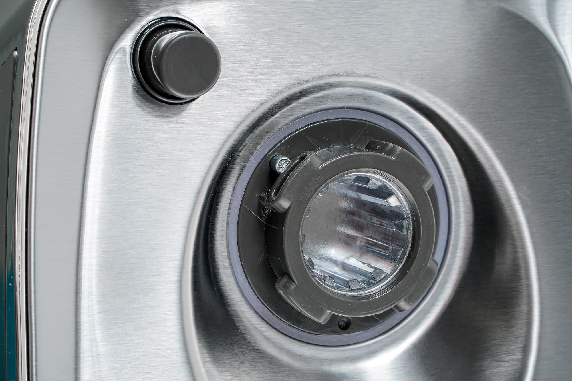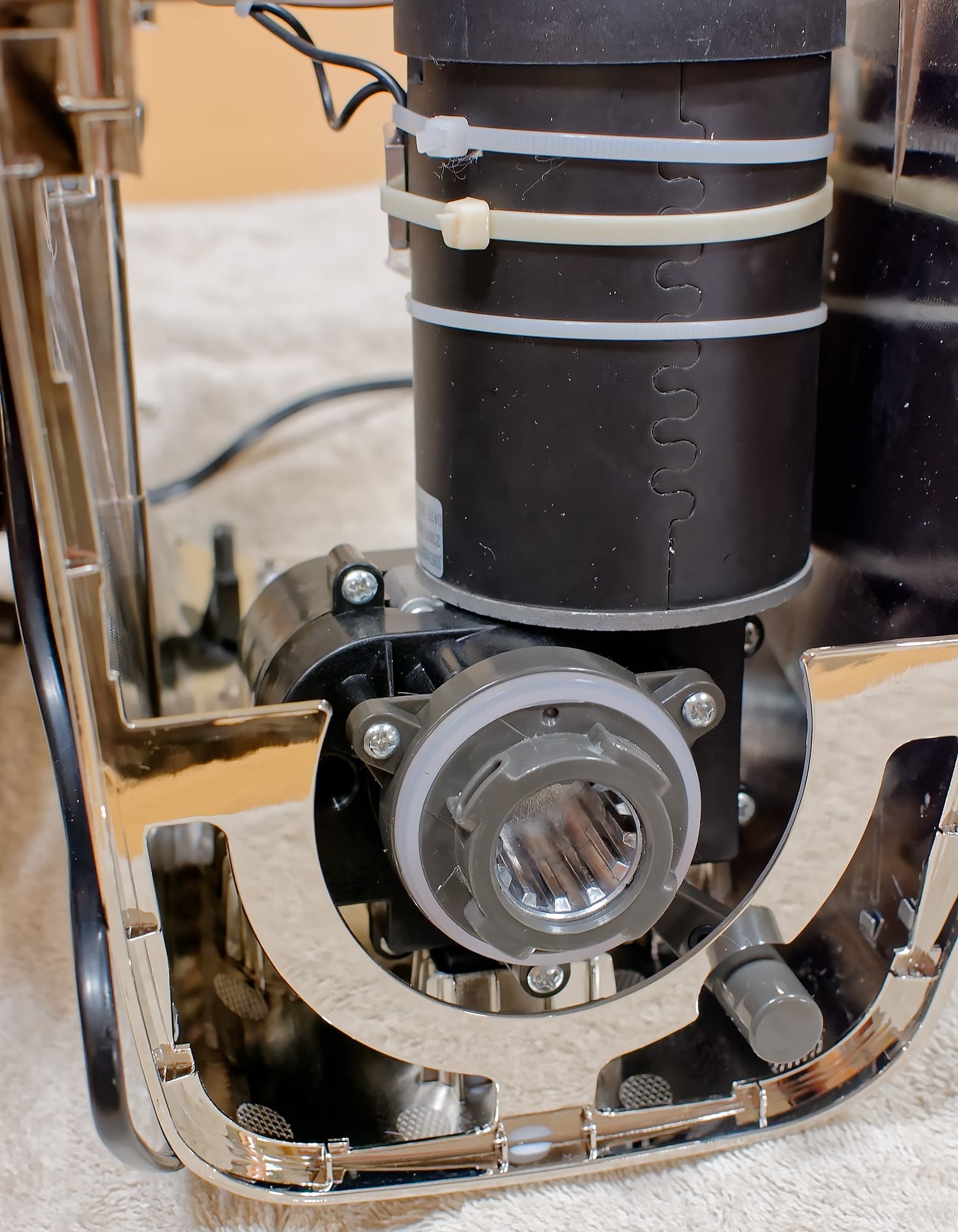 На передней стенке моторного блока расположен байонет крепления мясорубки: она вставляется в него под углом в 40° (необходимо попасть в пазы, но это просто) и при нажатой кнопке поворачивается до вертикального положения. Материал соединения приводного вала и шнека мясорубки — металл/металл.