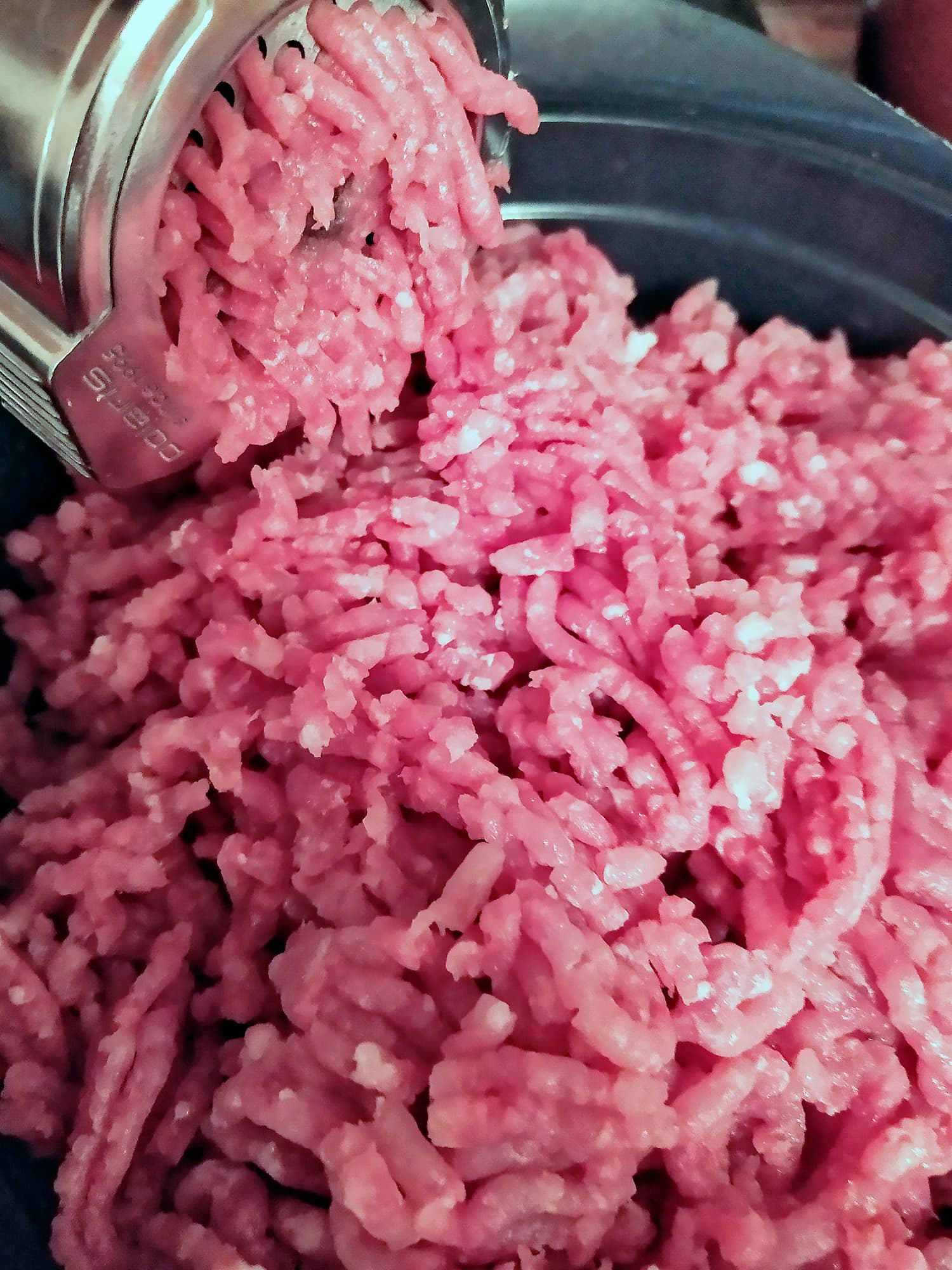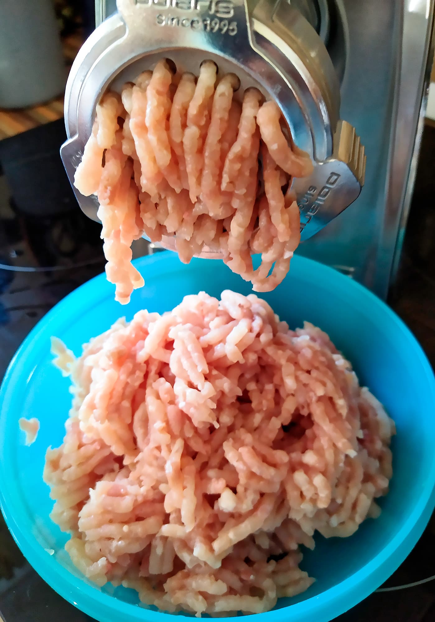 Вставили среднюю решетку и расправились с ними в считанные секунды. Фарш вымешали и снова отправили ненадолго в холодильник.