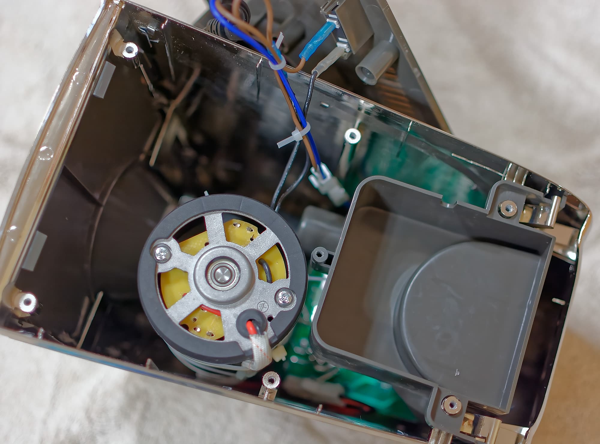По инструменту разборка оказалась несложной: от начала до конца нам хватило одной крестообразной отвертки. Головки части саморезов со стороны днища вполне предсказуемо были спрятаны за ножками, их пришлось аккуратно извлечь.