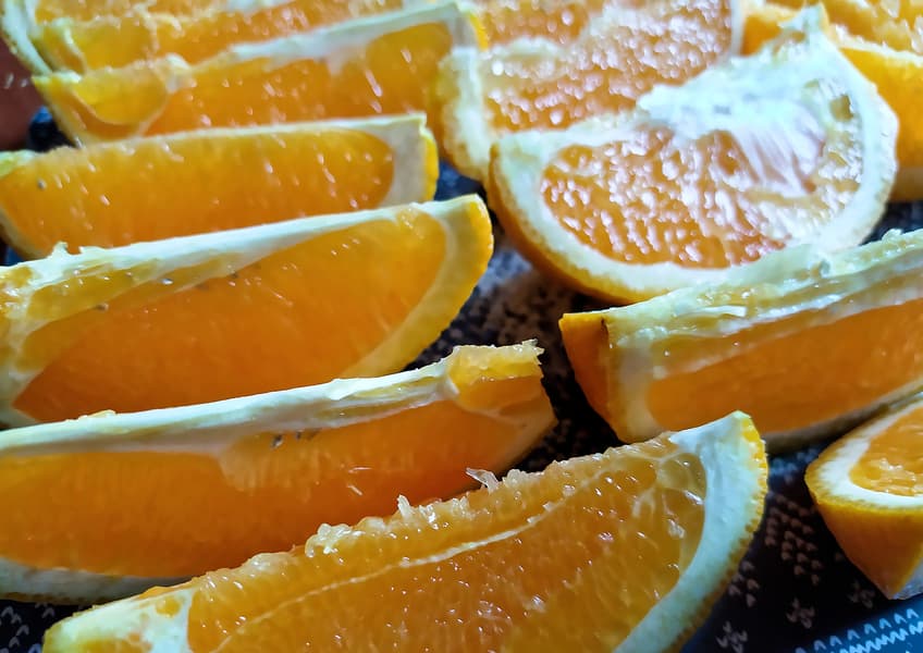 1 кг сочных апельсинов с кожурой нарезали дольками так, чтобы они помещались в горловину.