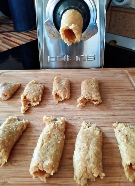 Вместо ножа и формовочного диска установили насадку, фарш положили на лоток, включили мясорубку на I скорости и стали формировать наши кеббе. Фарш выходит из насадки в виде трубочки, необходимого размера заготовку для кеббе надо срезать или отрывать руками (нам больше понравился второй вариант). Можно приноровиться и делать это в одиночку, но мы привлекли ассистента и делегировали ему загрузку фарша в мясорубку и оперативное выключение прибора в случае необходимости. Видимо, фарш оказался рыхловат — у трубочек получался рваный край.