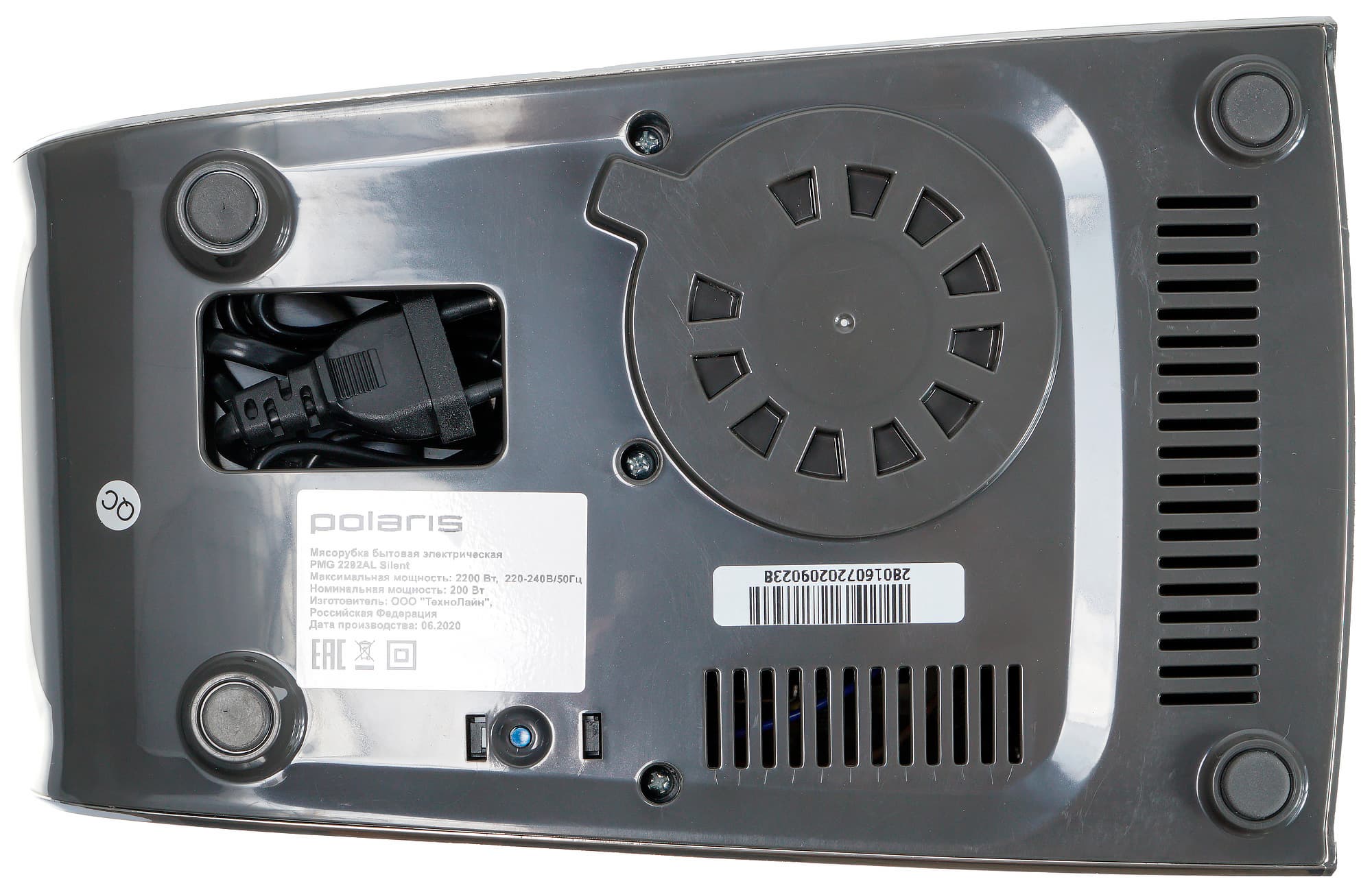 Снизу мы видим вентиляционные отверстия, наклейку с технической информацией и еще один бонус PMG 2292AL Silent — отсек для хранения шнура. Корпус крепко стоит на четырех прорезиненных ножках.
