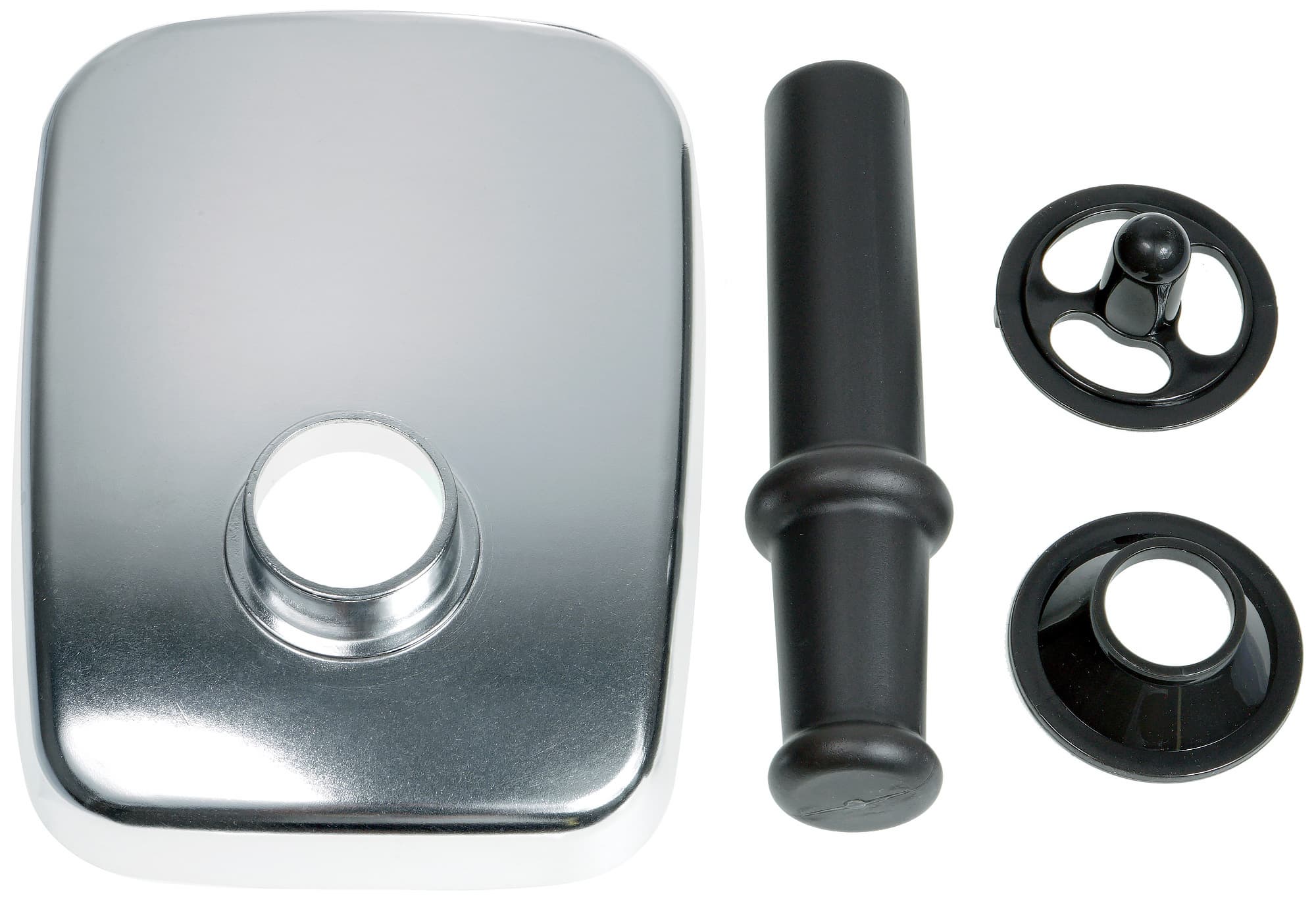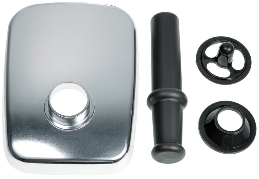 На горловине мясорубки устойчиво закрепляется металлический лоток для мяса. Также в комплект входят пластиковый толкатель, комплект для изготовления кеббе и длинная коническая трубка для набивки колбасных изделий — тоже из пластика.