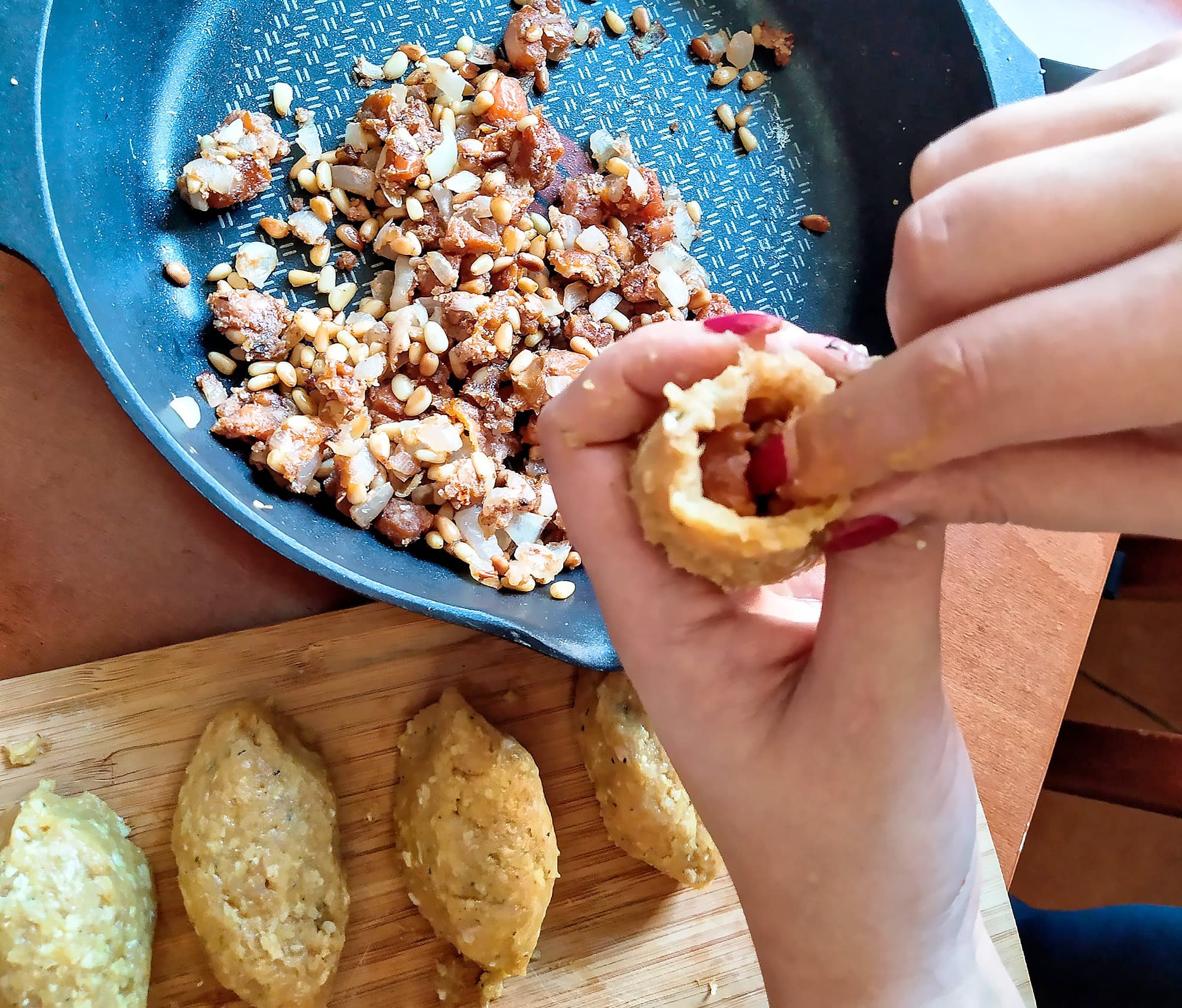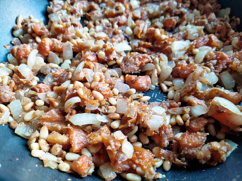 Занялись начинкой. Обжарили кедровые орешки на сухой сковороде, затем подлили оливкового масла, добавили нарезанный лук и курагу. Быстро обжарили все вместе, под конец добавили корицу и молотые грецкие орехи.