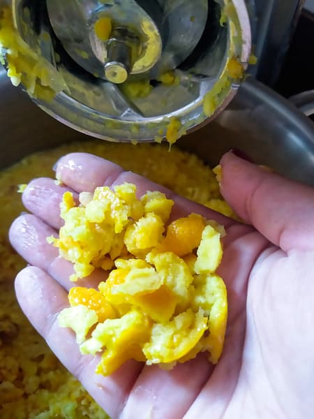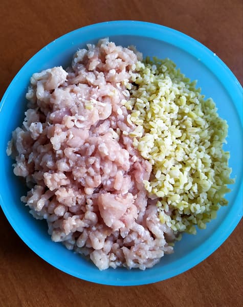 Получившуюся массу прокрутили в мясорубке, используя диск с самыми маленькими отверстиями. Процесс шел быстро, в фарше ощущались кусочки булгура, но под конец из мясорубки стали появляться желтые «колбаски», и мы поняли, что много крупы осталось внутри, хотя вся курица уже была в миске.