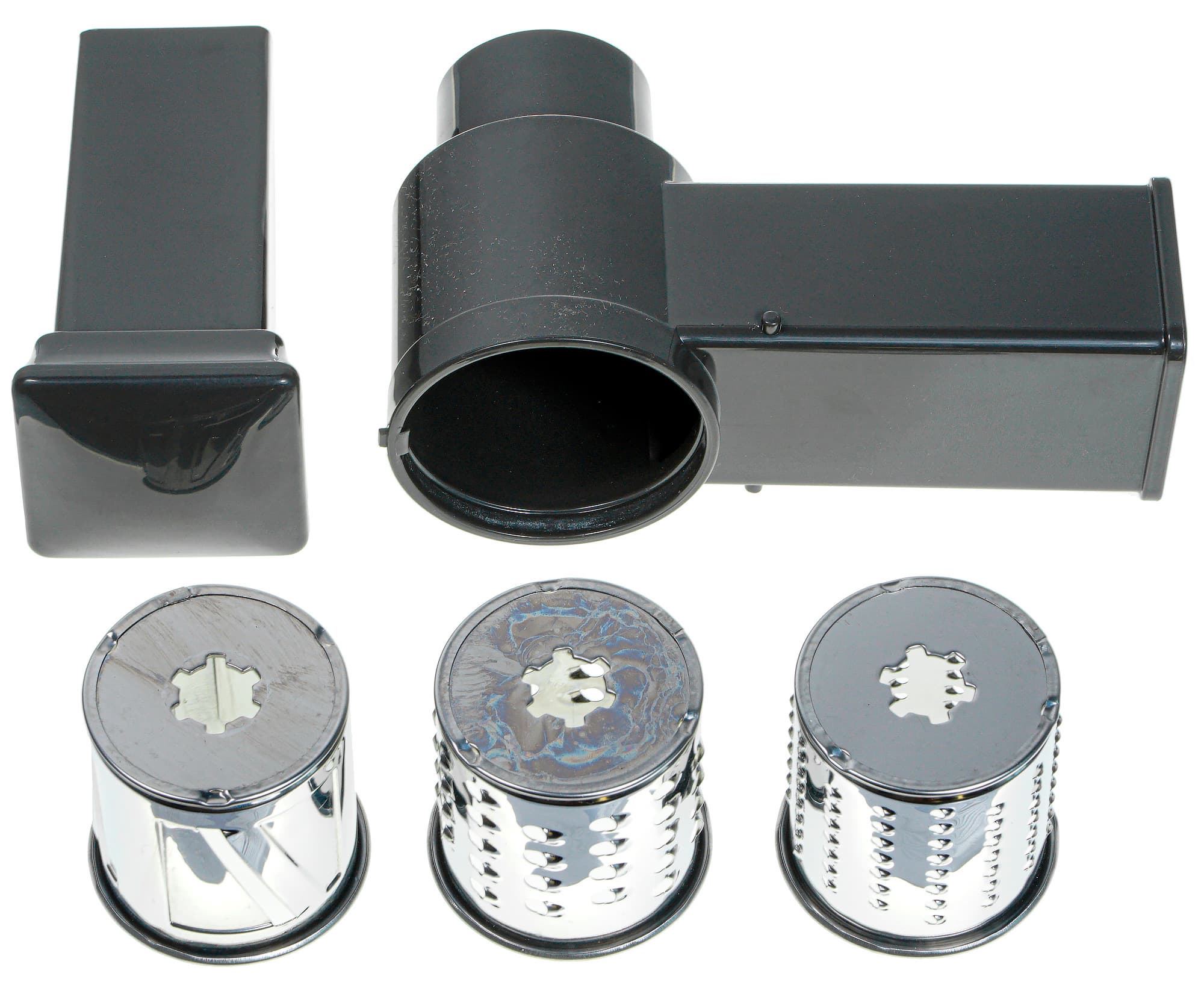 Насадка-овощерезка состоит из пластиковых рабочей головы и толкателя и трех металлических барабанов: шинковки и двух терок, мелкой и крупной. Размер загрузочного отверстия — 4,5×5 см. Барабан просто вставляется в корпус при совмещении отверстия на дне с выступами на валу корпуса. Терки диаметром 6 см и столько же длиной выполнены довольно топорно: швы и загибы грубые и выглядят дешево. Впрочем, вся насадка — как будто часть простецкой электрической терки.