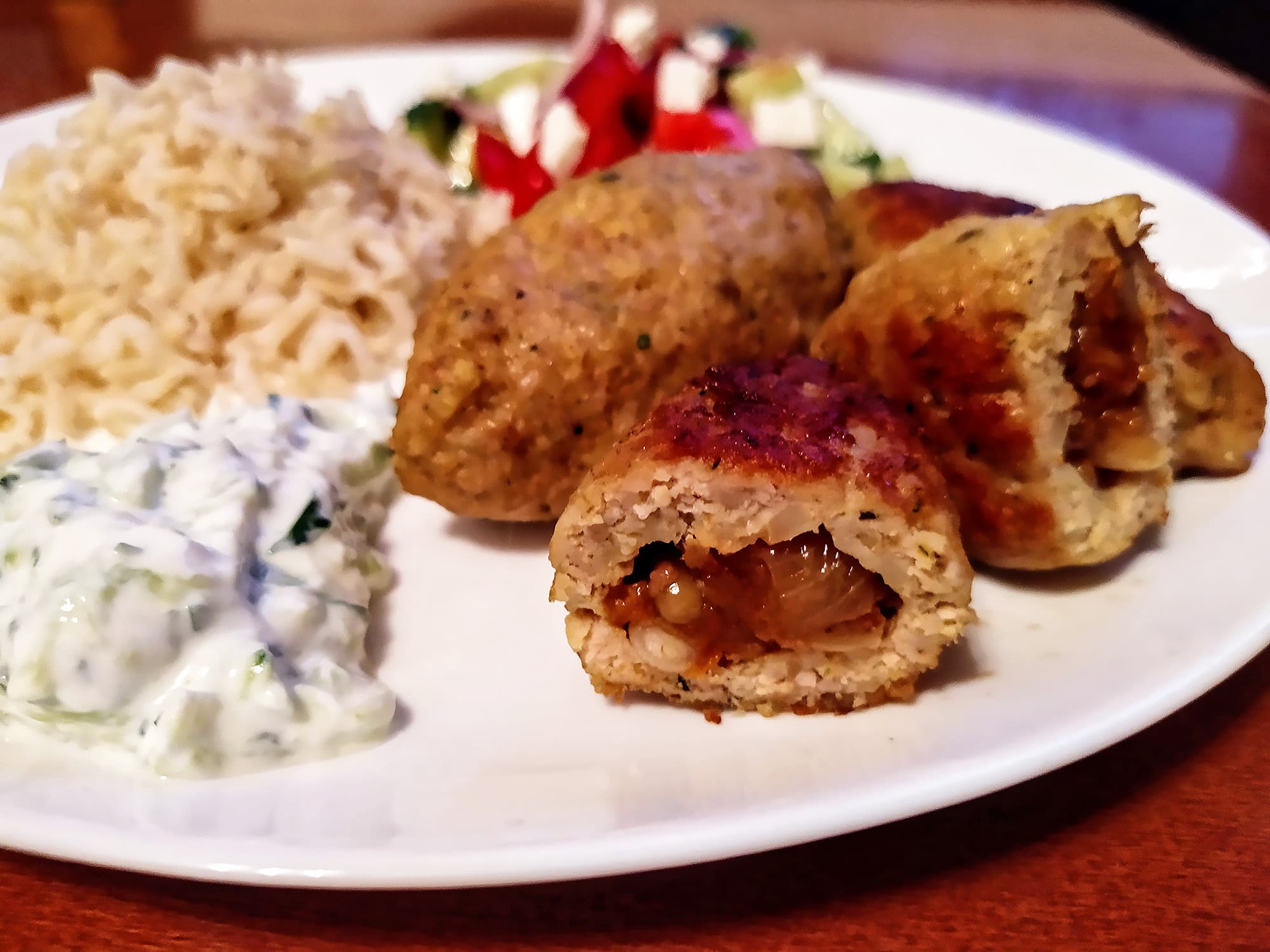 Получились отличные котлетки с пряным ароматом Востока. Подали их с бурым рисом, овощным салатом и соусом дзадзики.