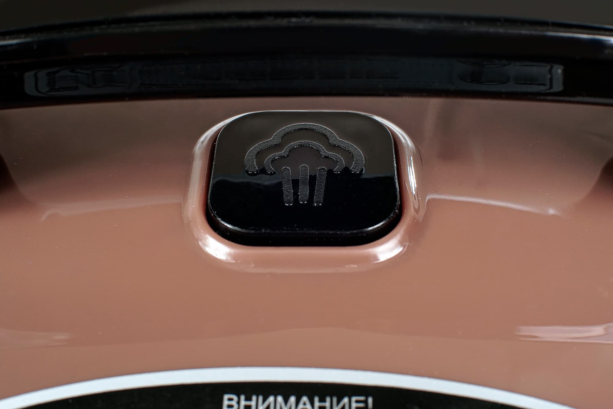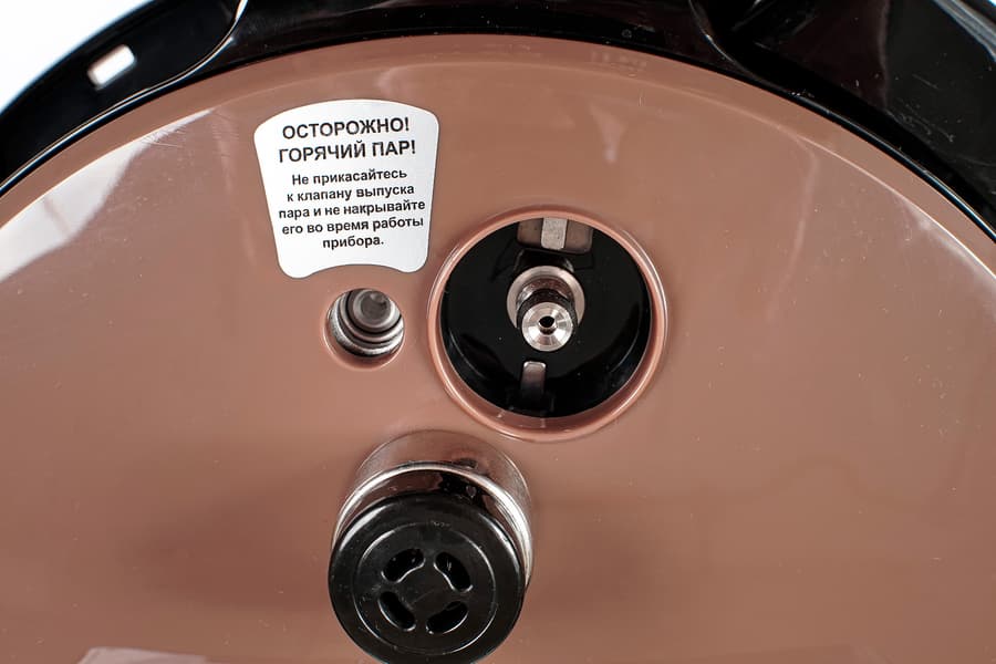 На крышке расположились кнопка для сброса пара, клапан и выходное отверстие. Кроме того, нас недвусмысленно предупреждают о том, что пар горячий, и советуют держаться подальше. Сам клапан очень легко вынимается для ухода.