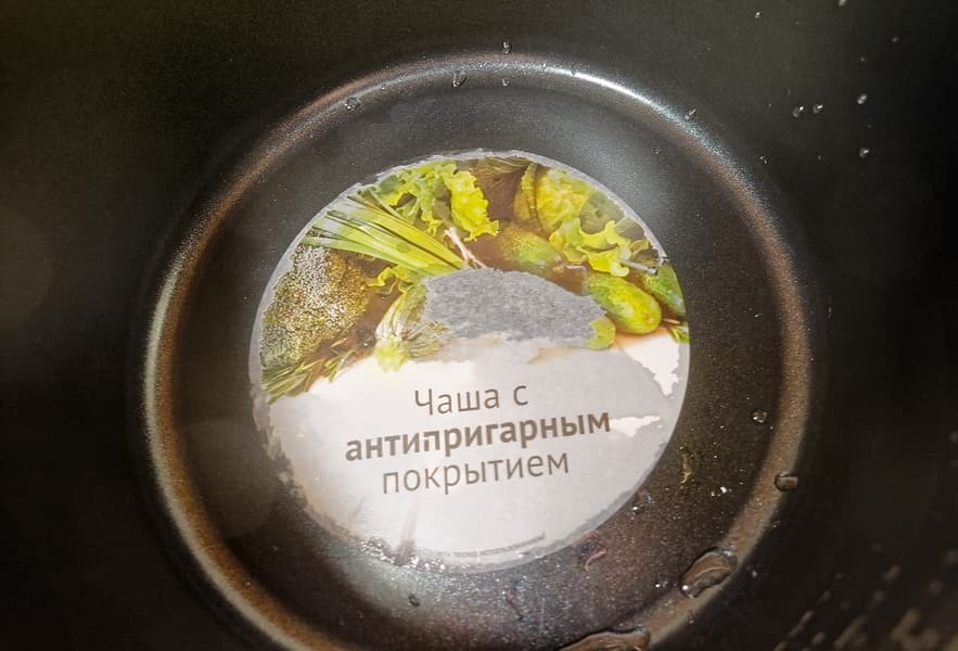 Перед эксплуатацией производитель рекомендует протереть корпус влажной губкой, чашу вымыть в теплой воде и просушить или хорошо вытереть. А еще — удалить все рекламные и информационные наклейки. И тут сюрприз! Помните сто тысяч упоминаний о том, что покрытие чаши антипригарное? Последнее нас ждет на дне самой чаши в виде многослойной наклейки, отделить которую обычному человеку в обычных условиях не под силу — приклеено на совесть! И только полтора часа под потоком горячей воды с периодическим трением мыльной губкой спасли ситуацию. Как выяснилось, подобную проблему испытывали многие пользователи. А главное — зачем в тысячный раз напоминать, что покрытие антипригарное? Мы об этом прочитали на коробке, в инструкции, в книге рецептов. Непонятно!
