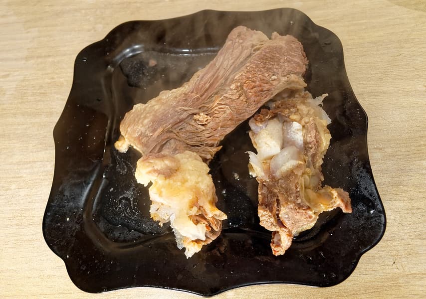 Очень часто для приготовления заготовок различных блюд требуется насыщенный крепкий бульон — не обязательно прозрачный, важно выварить из мяса все возможное. В этом случае бульон варят долго — от 3 до 6 часов, чтобы мясо отдало бульону все соки. Получится ли это сделать быстрее с PPC 1005AD? Мы взяли кусок говяжьей грудинки на кости весом в 980 г, промыли, зачистили и залили водой до максимально возможного уровня.