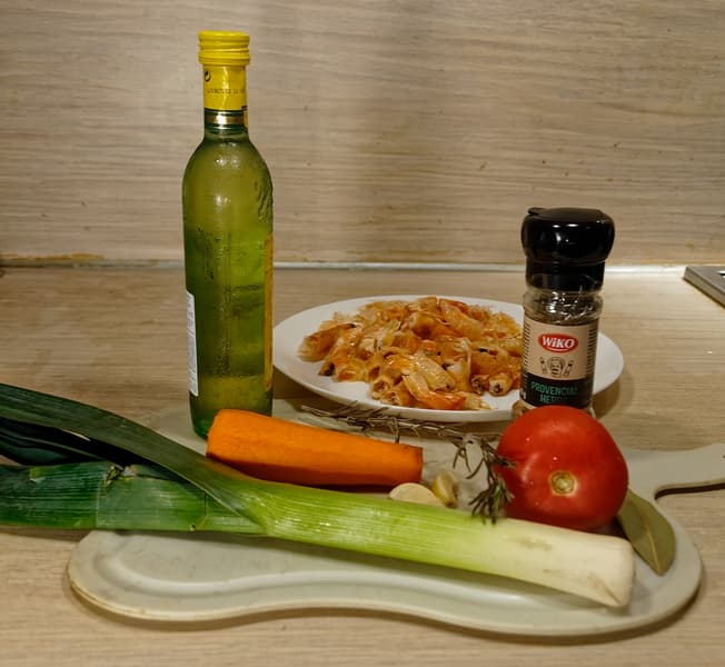 Мы взяли примерно 500 граммов очистков от креветок, лук-шалот, репчатый лук, морковь и помидор. Также в дело пойдут веточки тимьяна, прованские травы и крупная соль.