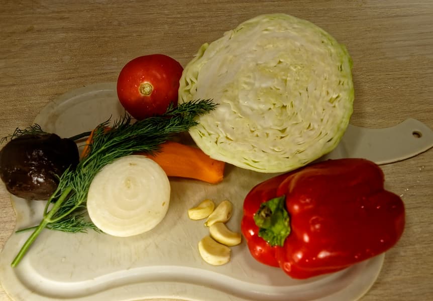 Лук, морковь и перец слегка пассеровали в растительном масле, свеклу варили отдельно, чуть позже к ней присоединился мелко нарезанный томат, еще чуть позже — домашняя томатная паста. На финальной стадии для придания стойкости цвету закислили свеклу соком лимона.