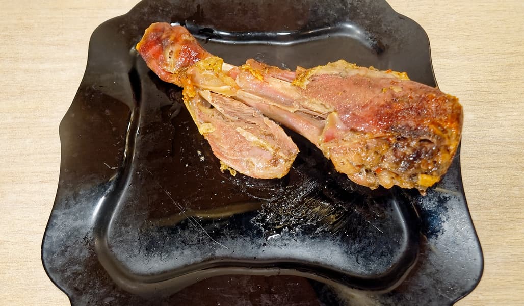 Голень индейки весом в 450 г ночь мариновалась в смеси перцев, в чесноке, вустерском соусе и соусе Шрирача. Перед запеканием ее дополнительно обмазали горчицей.
