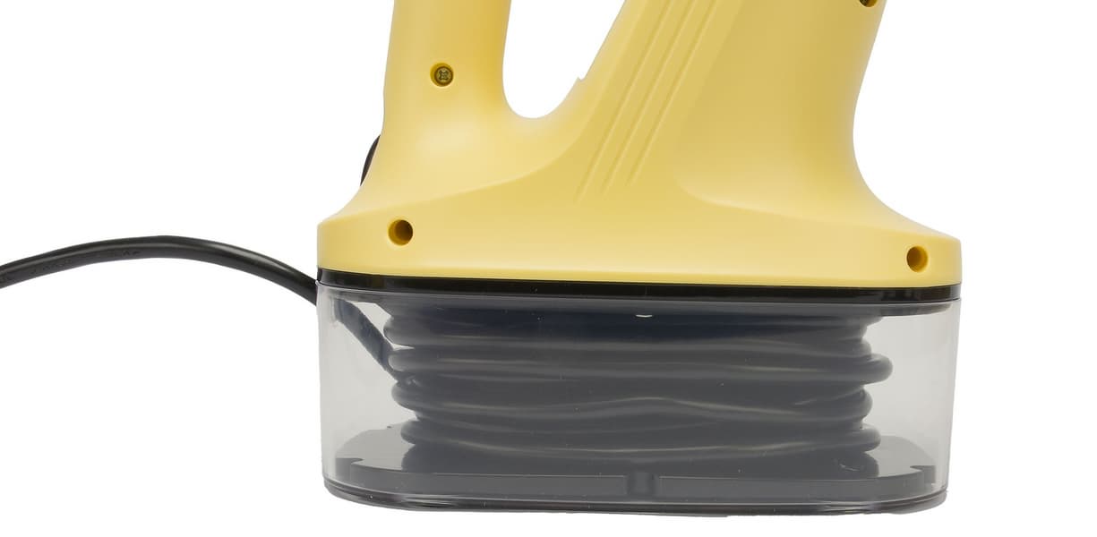 Когда мы впервые достали прибор из коробки, он показался нам довольно тяжелым — почти 2,5 кг. Однако при более внимательном осмотре стало понятно, откуда берется такой вес: половина массы приходится на шнур питания, аккуратно намотанный в нижнем отсеке корпуса. После взвешивания выяснилось, что сам пароочиститель весит всего около 1,3 кг без шнура. Так что первые опасения по поводу «тяжелого прибора» оказались напрасными.
