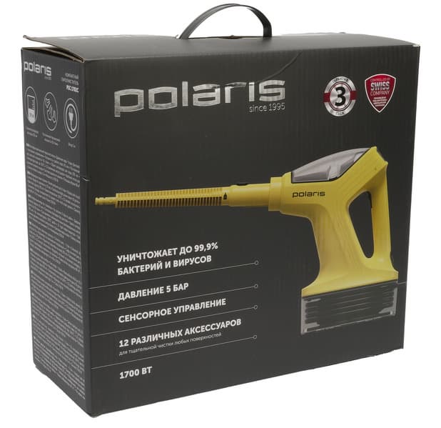 Пароочиститель Polaris PSC 1702C прибыл к нам в добротной коробке чуть выше средних размеров. Упаковка выполнена из плотного картона черного цвета, с крупным изображением устройства и насадок в контрастных желтых оттенках. Дизайн солидный, современный, полностью соответствует стилю бренда, без излишней пестроты, но с чувством уверенности в продукте.