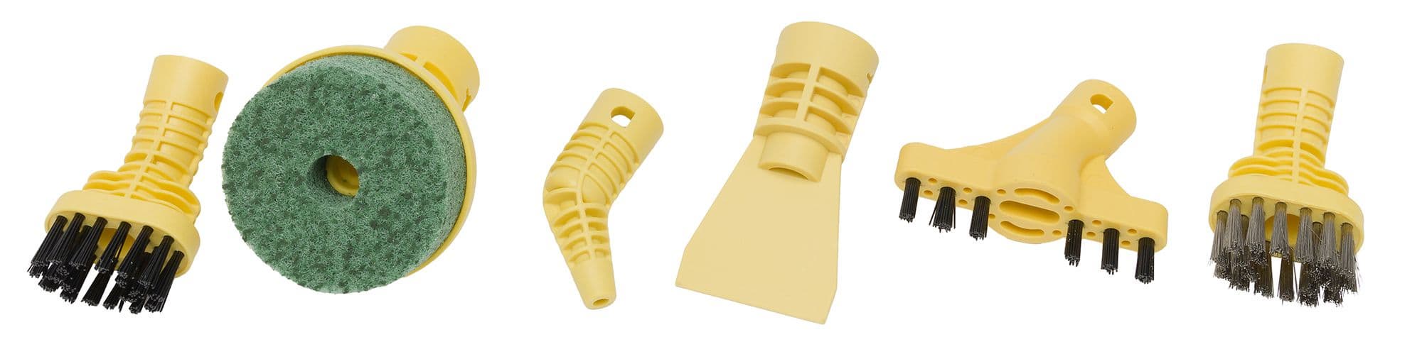Пароочиститель укомплектован различными насадками и щетками, предназначенными для разных видов уборки: