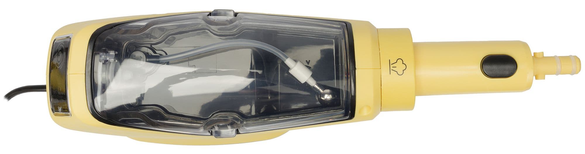 В целом эксплуатация оставила положительное впечатление. Руки во время работы не устают т. к., в основном прибор удерживатся не за корпус, а за удлинительный шланг. Единственное, чего хотелось бы — чуть больший запас воды и удлиненный шланг для более комфортной уборки.