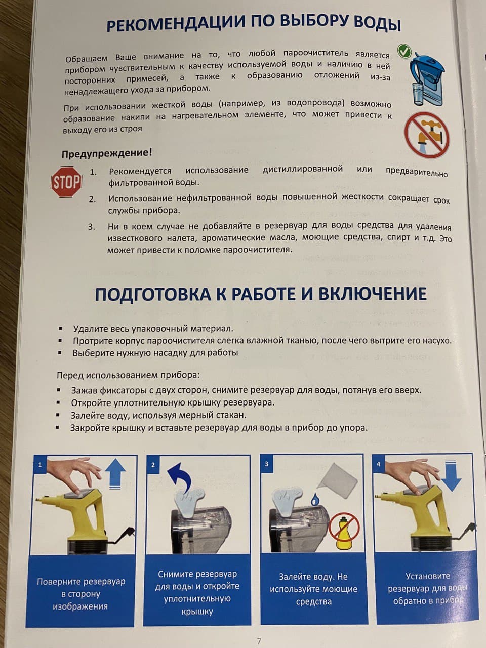 Уже с первых строк производитель акцентирует внимание на том, что пароочиститель чувствителен к качеству воды и требует правильного ухода. В тексте отдельно отмечено: использование воды с примесями, без регулярной очистки от накипи или при несоблюдении правил обслуживания может привести к снижению эффективности и поломке прибора.