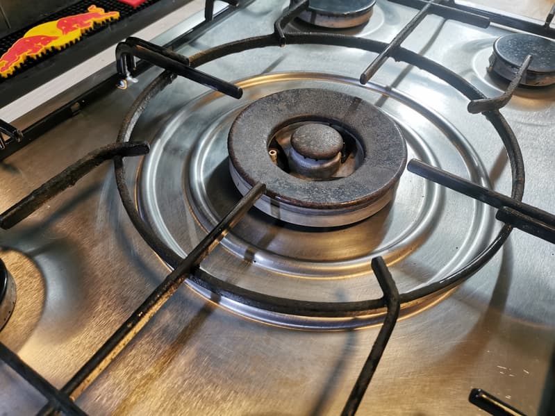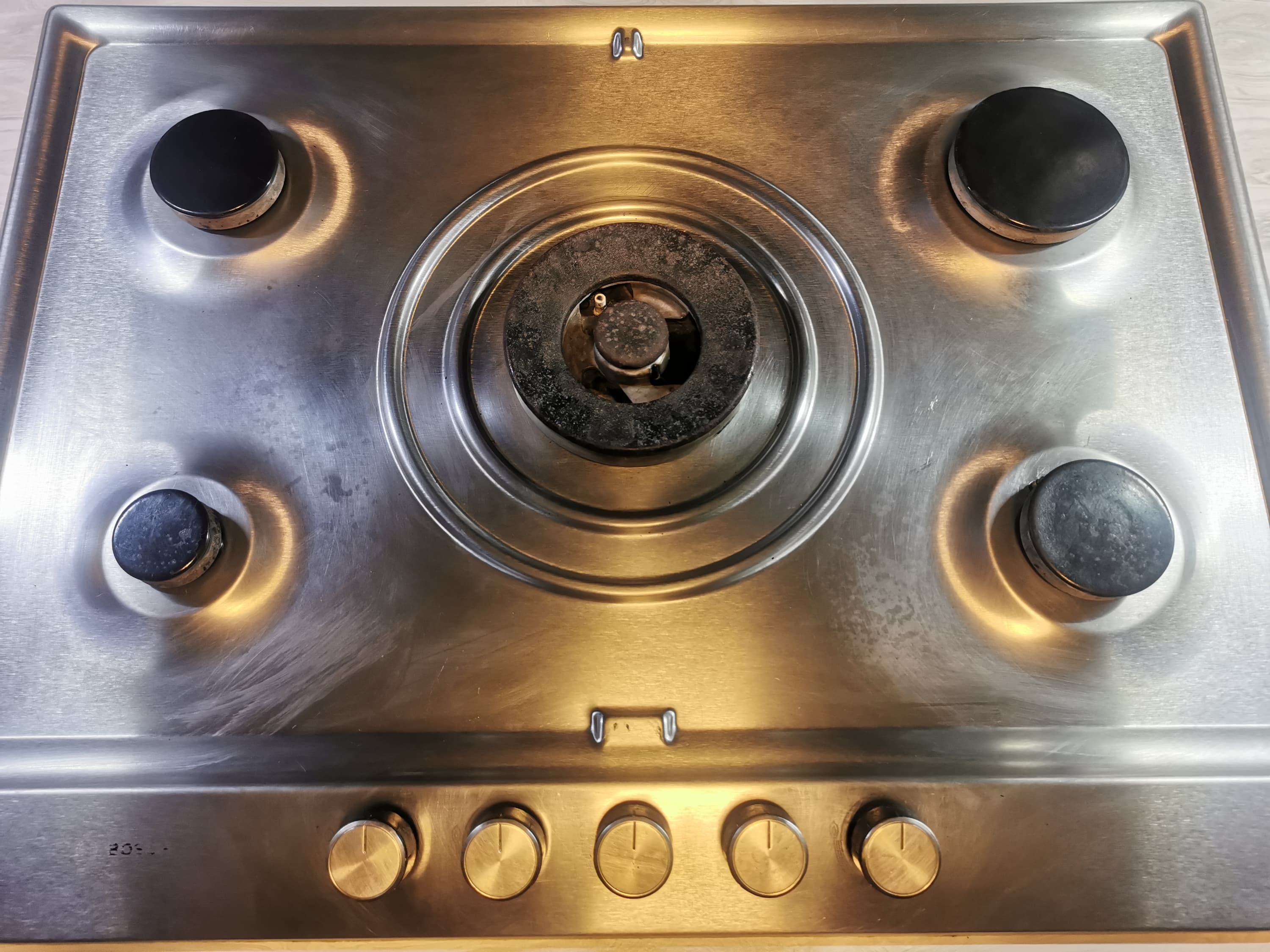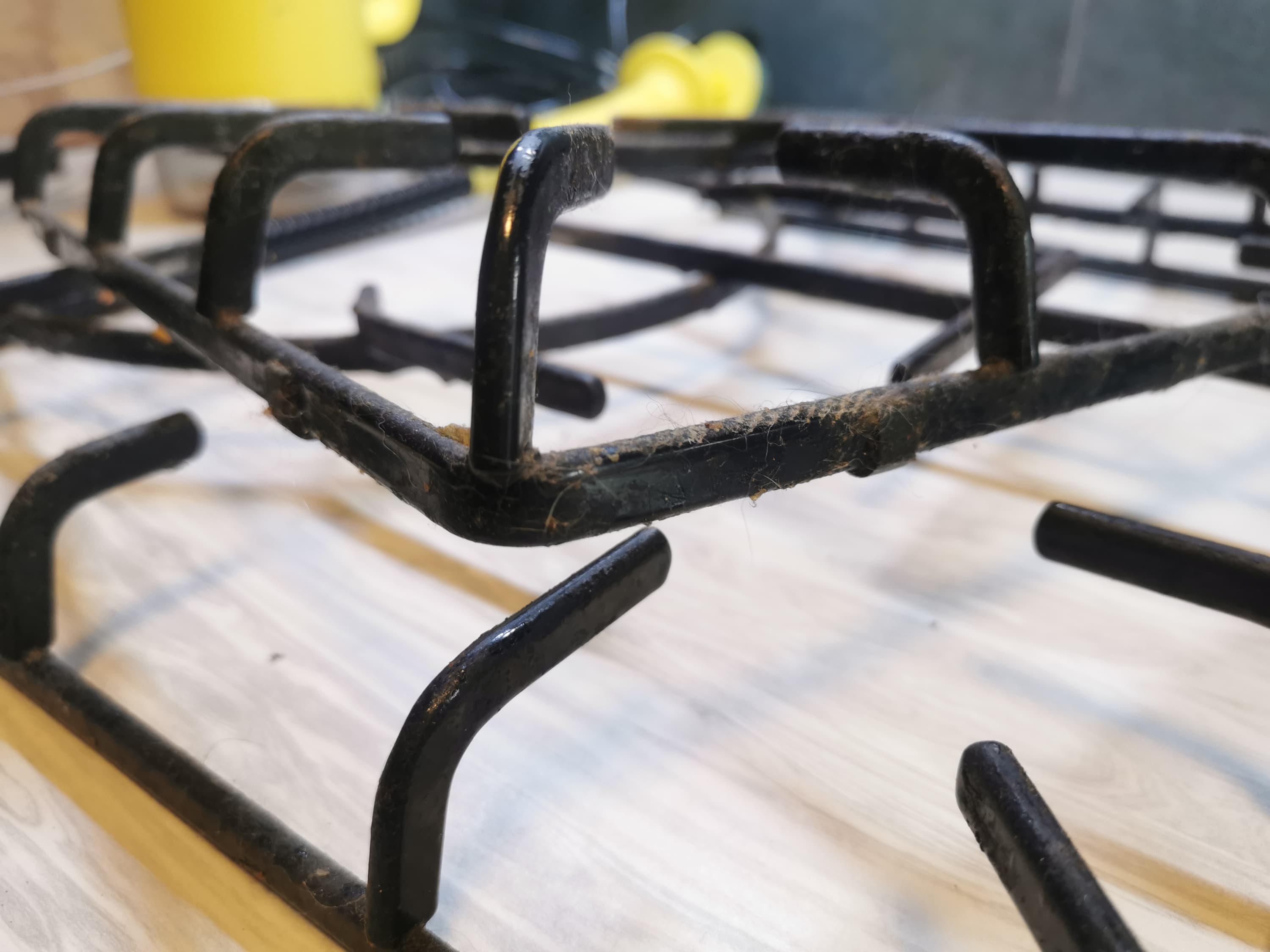 Далее мы приступили к газовой варочной поверхности с 5 конфорками, 2 металлическими решетками, 1 металлической подставкой и множеством следов эксплуатации.