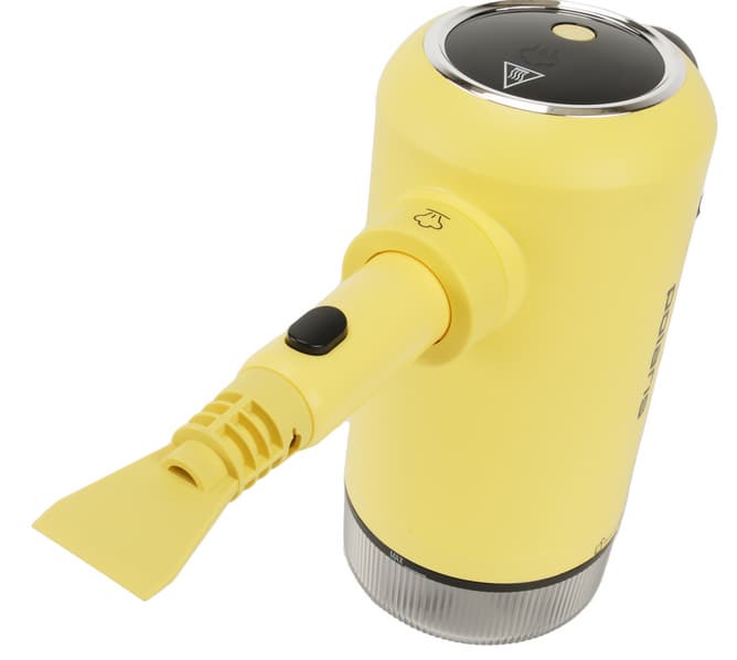 Корпус устройства выполнен в основном из из желтого пластика, но имеет и несколько черных вставок, кнопок и круглый черный дисплей сверху. У прибора простая и понятная конструкция: пароочиститель состоит из моторного блока с ручкой и рабочей части — сопла.