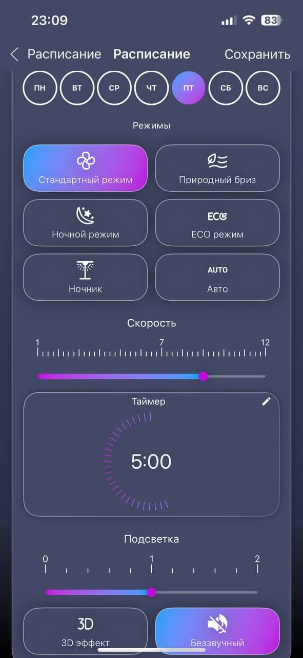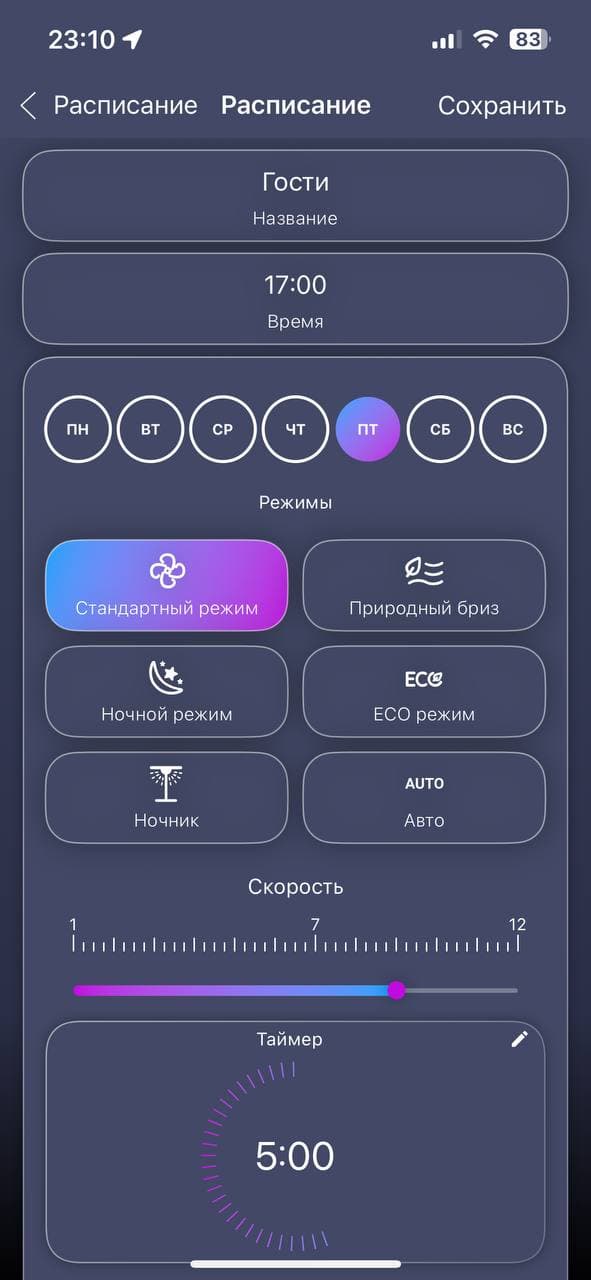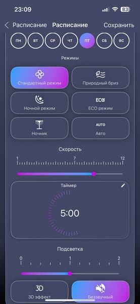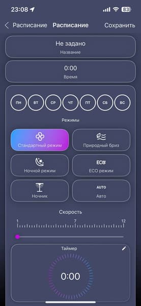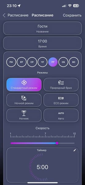 Функция «Расписание» позволяет создать бесконечное количество запланированных включений в конкретное время и день недели, подобрав нужную программу, скорость, отрегулировать повороты, поставить таймер отключения.