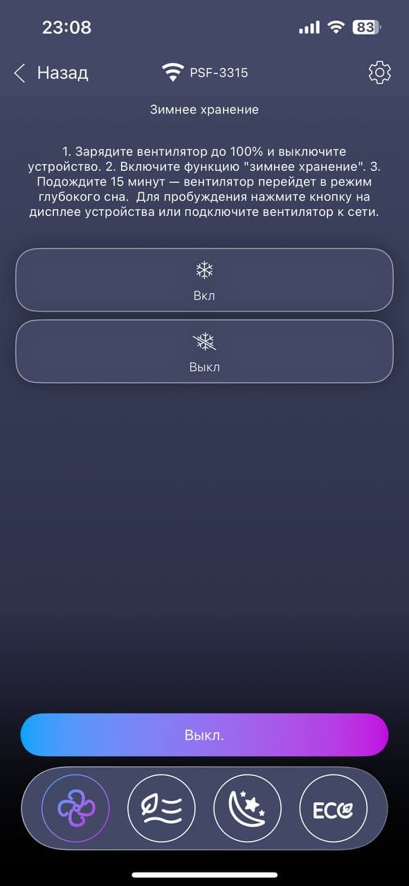 Опция «Зимнее хранение» подробно описывается при нажатии на соответствующую кнопку на главном экране. Здесь же ей можно воспользоваться.