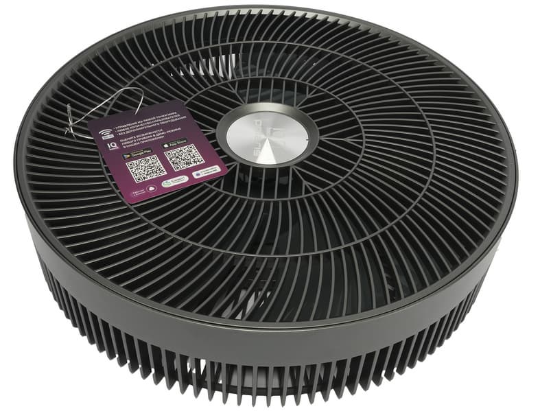 На верхней части корпуса снизу имеется фиолетовая наклейка, сообщающая о том, что к прибору можно подключиться с помощью NFC соединения. Помимо ручки и дисплея, здесь имеется еще и светодиодная подсветка, расположенная кольцом под белым пластиком — ее можно видеть снизу, под местом крепления защитных кожухов и лопастей.