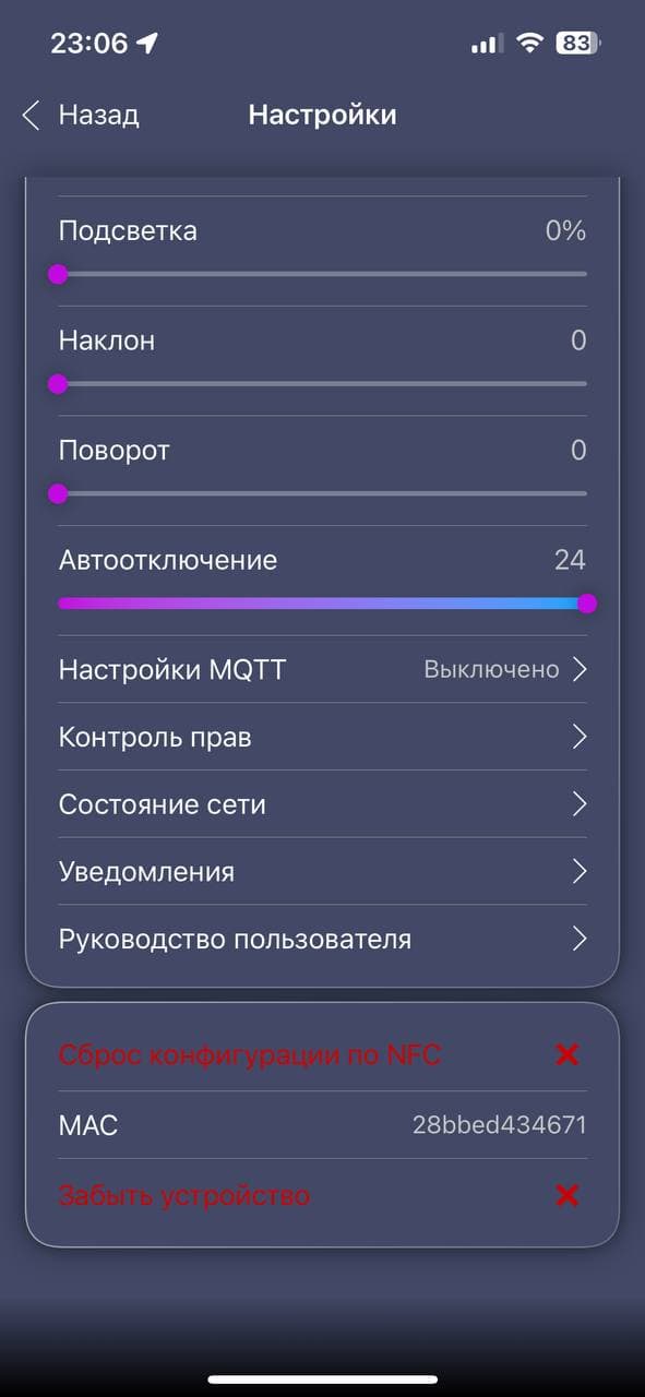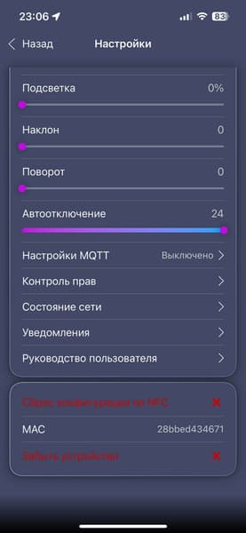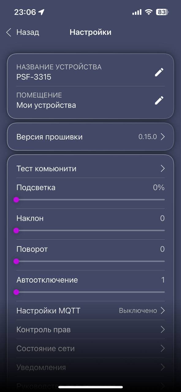 Здесь мы можем изменить имя прибора и помещения в котором он находится. Посмотреть последняя ли версия прошивки у нас установлена, отрегулировать возможности подсветки — если здесь она отключена, то и на главном экране включить ее не получится, отрегулировать допустимые уровни поворота как для вертикального, так и для горизонтального движения, установить время для автоотключения от 1 до 24 часов.