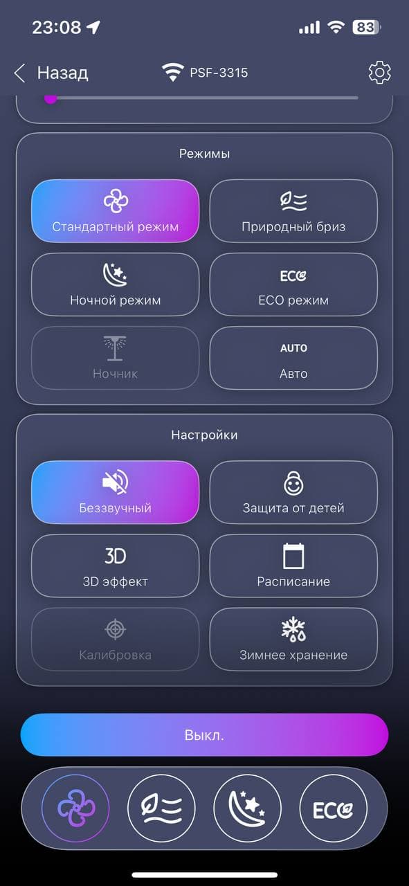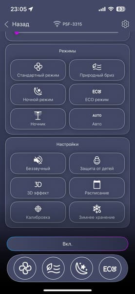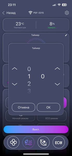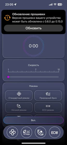 - «Ночной режим»: скорость обдува будет снижаться на 1 уровень каждые 30 минут до минимального значения