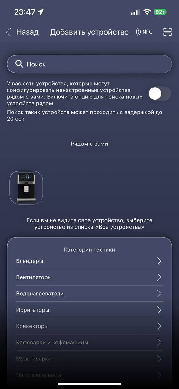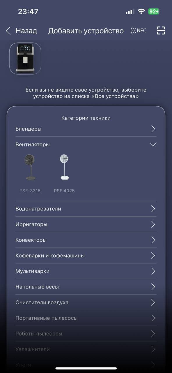 Нажимаем синюю кнопку «Добавить устройство», включаем на телефоне Bluetooth и либо выбираем устройство среди распознанных поблизости, либо вручную находим его в разделе «вентиляторы» по наименованию модели и картинке.