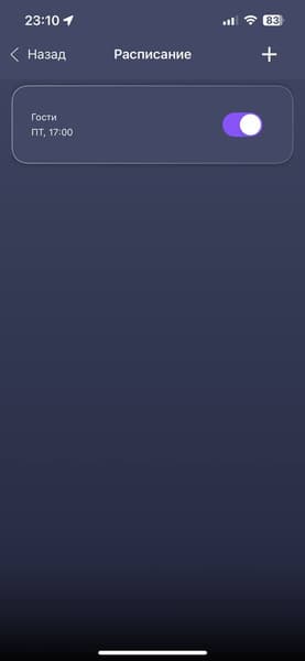Мы создали программу «Гости» на вечер пятницы, подразумевая, что к приходу гостей у нас будет свежо и комфортно, даже если мы сами не будем успевать подготовиться. Программа сохранилась в памяти и рядом с ней появился бегунок включения/отключения, значит мы смогли бы и в дальнейшем пользоваться ей, не тратя время на настройки, хотя на них и ушло всего порядка 2 минут. Но иметь персональные программы — это всегда удобно.