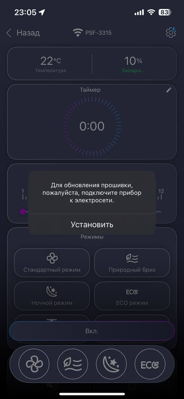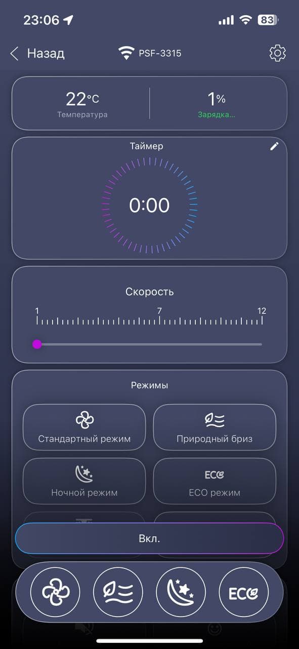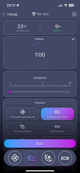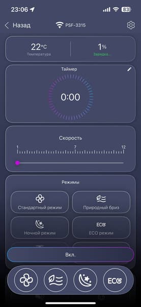 Управление со смартфона показалось нам самым комфортным для использования данной модели вентилятора. В нем можно за минуту настроить нужный режим, опции, заблокировать/разблокировать панель управления (и в принципе увидеть в каком статусе она сейчас), узнать температуру, уровень заряда, одним махом отрегулировать скорость с 1 по 12. Тут все действительно сделано на совесть. Также нас порадовало быстрое подключение прибора без танцев с бубном.