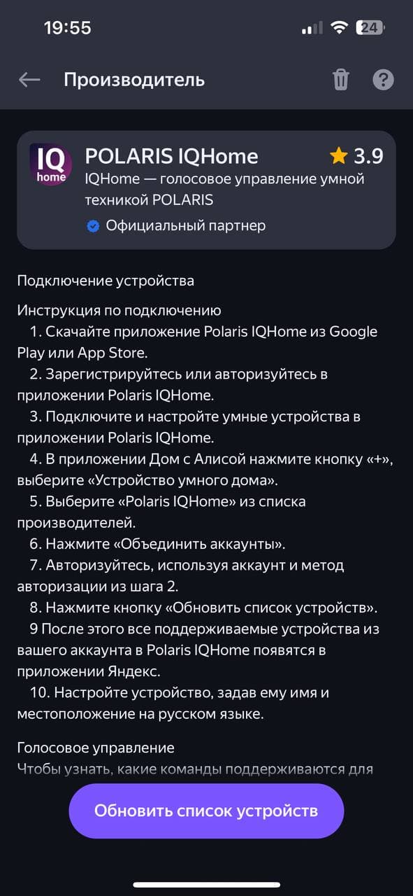| Управление со смартфона | через приложение Polaris IQ Home |