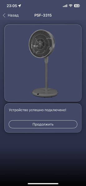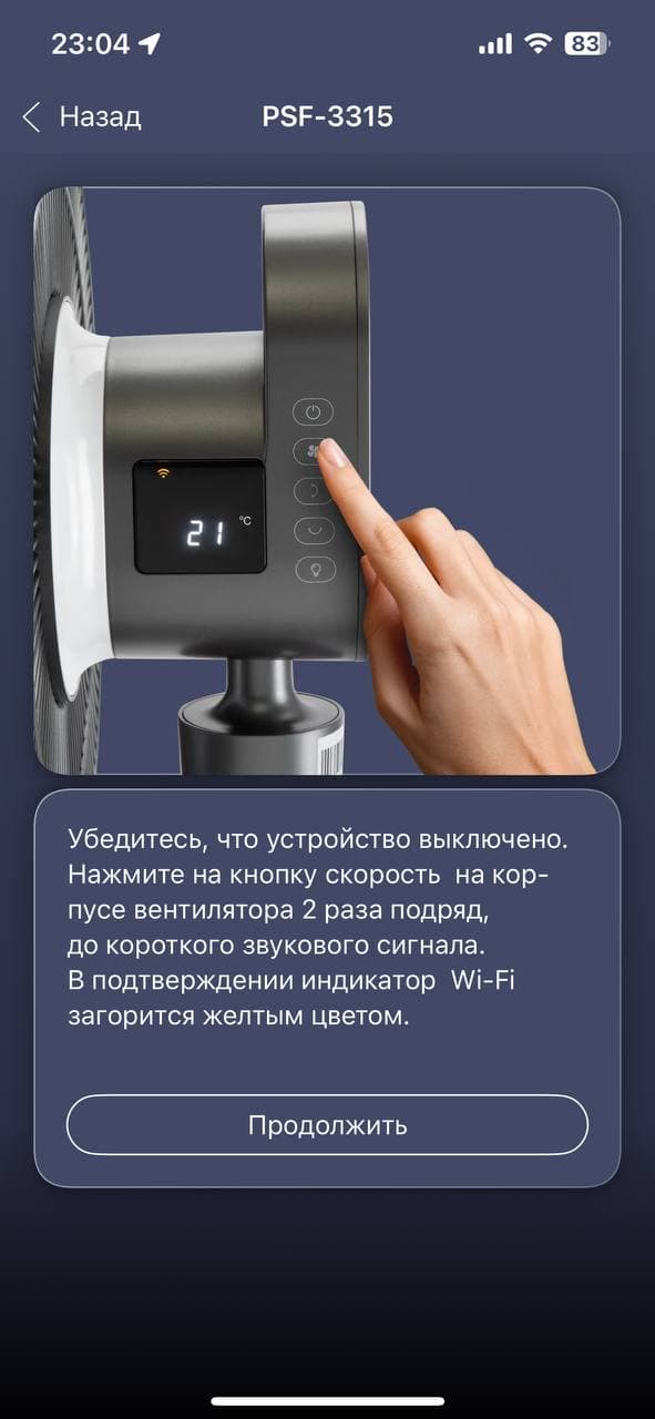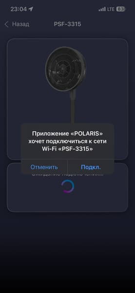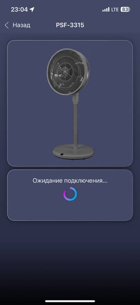 Далее дважды быстро нажимаем на вентиляторе, находящемся в режиме ожидания, кнопку переключения скоростей (вторая сверху), чтобы начать сопряжение устройств и дожидаемся его завершения. Нам предлагается сначала подключится к сети вентилятора, после чего мы можем настроить подключение уже к нашей сети Wi-Fi.