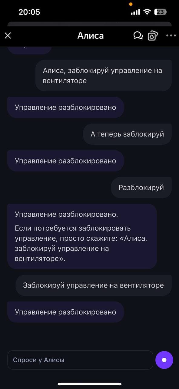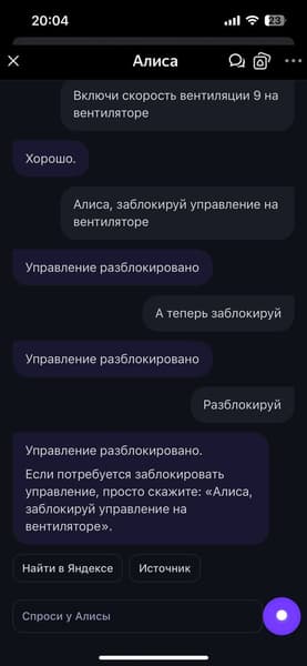 Следующая сложность: разблокировать управление Алиса соглашается, а на просьбу заблокировать отвечает, что сделала, умничает, как с ней лучше говорить, но делает в итоге наоборот. Ну что ж, половина задачи выполняется — уже неплохо (для голосового помощника).