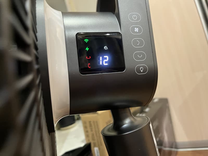 Панель управления с дисплеем расположена с левой стороны моторного блока и вращается вместе с крыльчаткой (если включено вращение). Вращение происходит достаточно медленно, и если есть потребность отрегулировать настройки или взглянуть на температуру на дисплее, то придется ждать удачного положения корпуса.