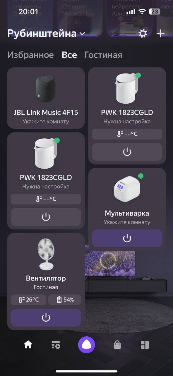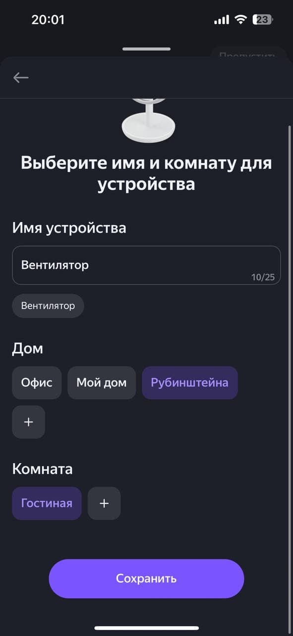 Заходим в приложение «Умный дом с Алисой» и спешим добавить новое устройство. Выбираем приложение Polaris IQ Home для привязки, обновляем список устройств и видим среди наших приборов «Вентилятор».